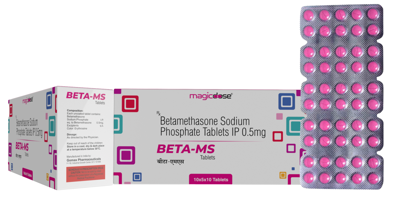 Betamethasone Sodium Phosphate Tablets IP 0.5 mg contain a highly potent corticosteroid formulated to provide rapid and effective relief from inflammatory, allergic, and autoimmune conditions. With strong glucocorticoid activity and minimal mineralocorticoid effect, it helps reduce swelling, redness, itching, and immune responses efficiently.