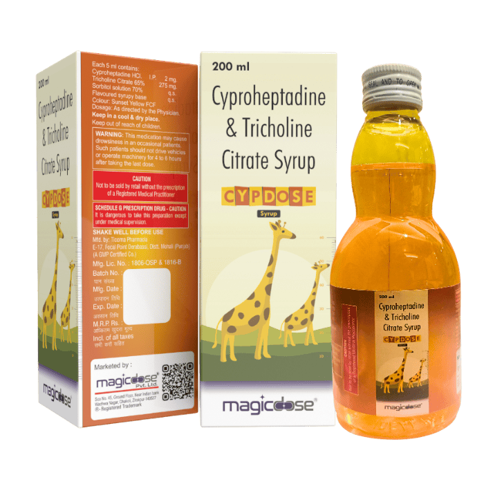 CYPDOSE Syrup is a highly effective appetite stimulant and liver tonic that helps improve overall nutritional intake and supports better digestion. It combines Cyproheptadine Hydrochloride, an antihistamine with appetite-stimulating properties, and Tricholine Citrate, a well-known hepatoprotective and lipotropic agent that supports liver function and fat metabolism. Uses / Indications: Loss of appetite Poor weight gain in children & adults Anorexia of various origins Liver disorders associated with anorexia Nutritional deficiencies Dyspepsia and indigestion Key Benefits: ✅ Stimulates appetite and promotes weight gain ✅ Enhances liver function and detoxification ✅ Aids in digestion and nutrient absorption ✅ Improves metabolism and overall well-being