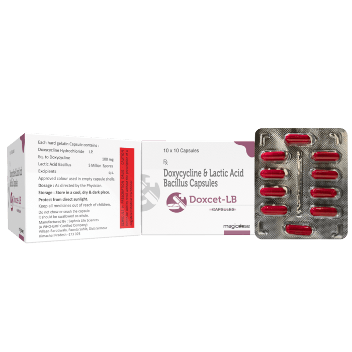 DOXCET-LB CAPS is a combination of Doxycycline 100 mg, a broad-spectrum tetracycline-class antibiotic, and Lactic Acid Bacillus, a probiotic that helps restore and maintain healthy intestinal flora. This formulation not only treats bacterial infections effectively but also reduces the risk of antibiotic-associated diarrhea and gastrointestinal disturbances. Uses of DOXCET-LB CAPS: Respiratory tract infections (bronchitis, pneumonia, sinusitis) Urinary tract infections (UTIs) Skin and soft tissue infections (including acne) Sexually transmitted infections (STIs) Intestinal infections and traveler’s diarrhea Prevents gut imbalance caused by antibiotics Key Benefits: Broad-spectrum antibacterial activity with added probiotic protection Reduces risk of diarrhea and digestive upset during antibiotic therapy Improves recovery and patient compliance Effective against resistant bacterial infections